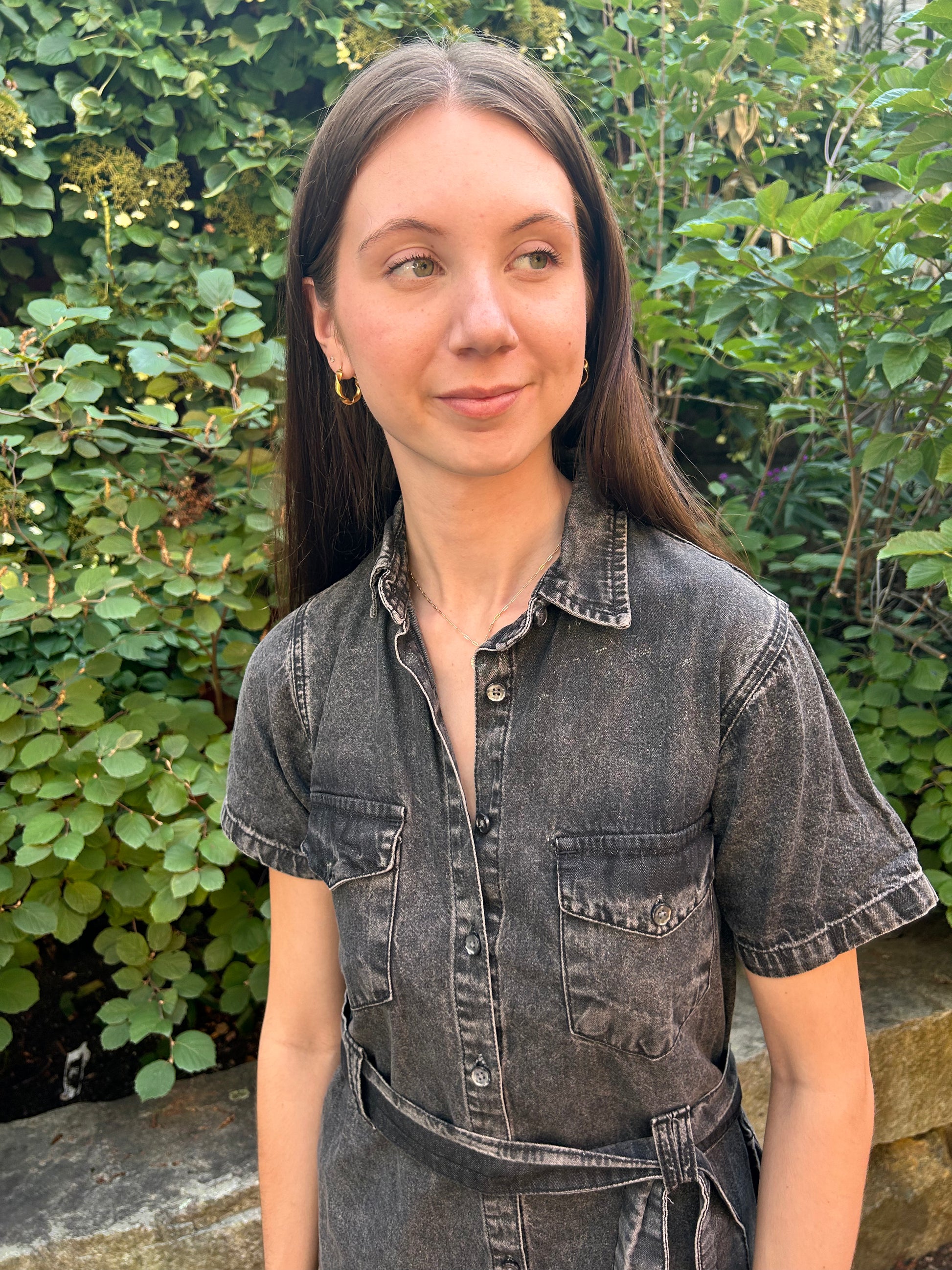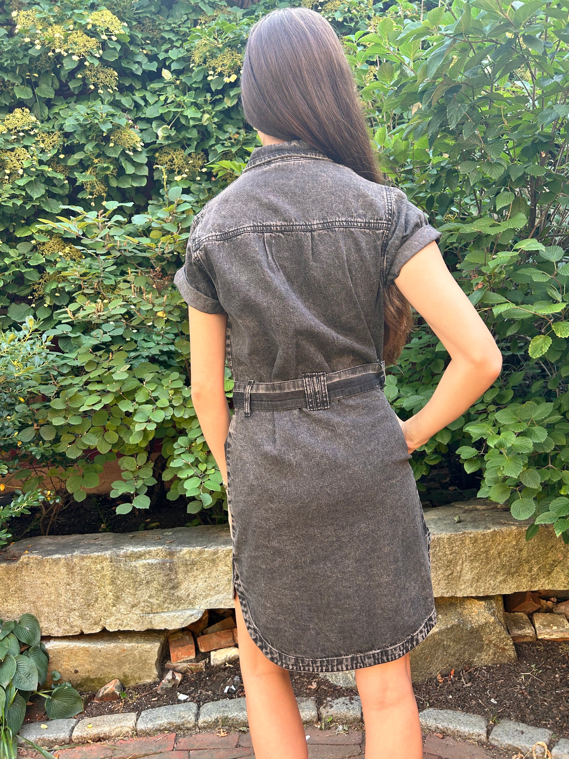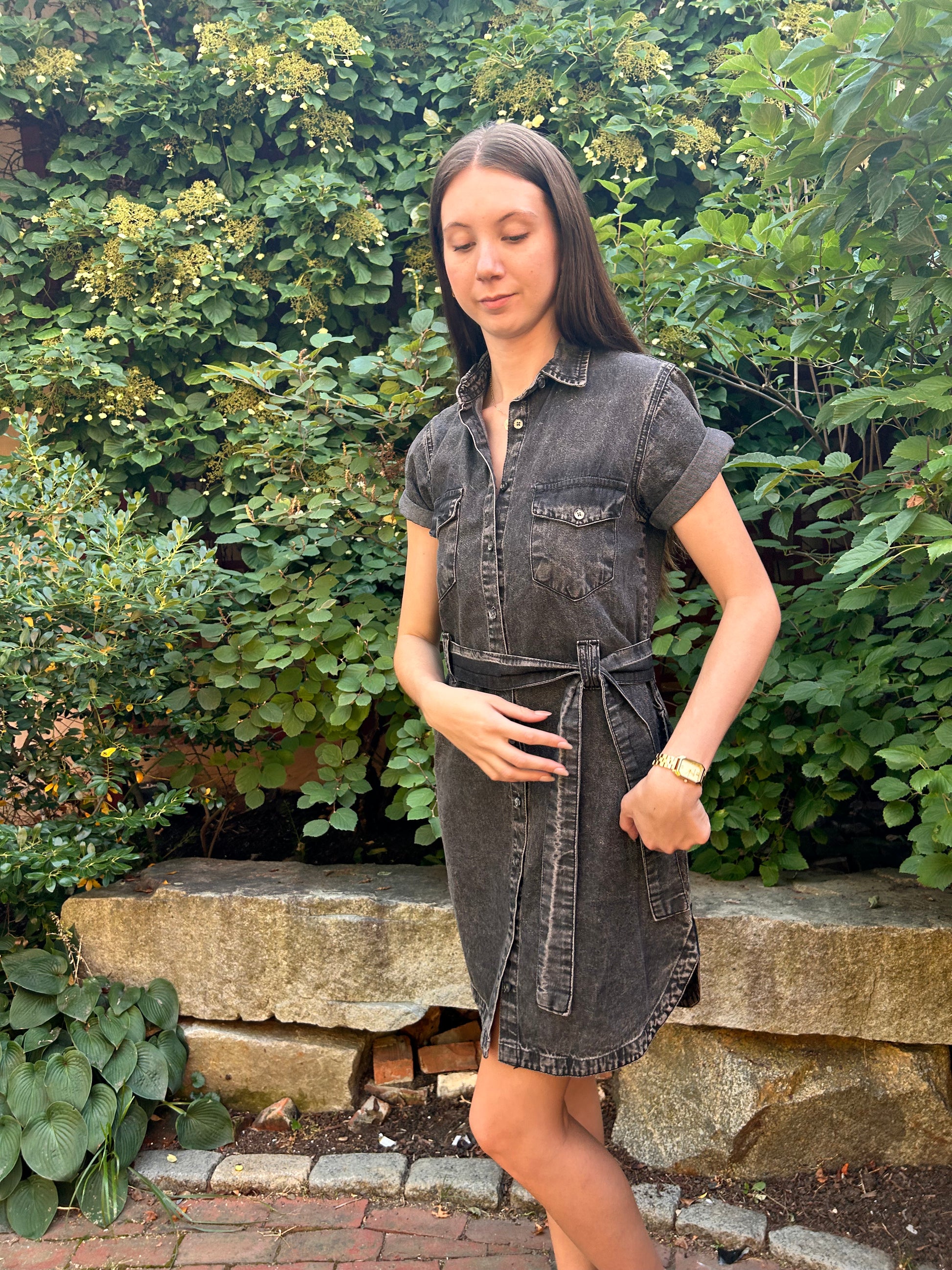 The Calla Black Denim Dress is the perfect versatile piece for any wardrobe. Made from acid washed cotton, this shirt dress is both chic and comfortable. With a functional button front and a flattering curved hem shape, you can wear it anywhere and always look put together. This machine washable and pre-shrunk dress is easy to care for. Take your style to the next level with this simple and stylish dress.