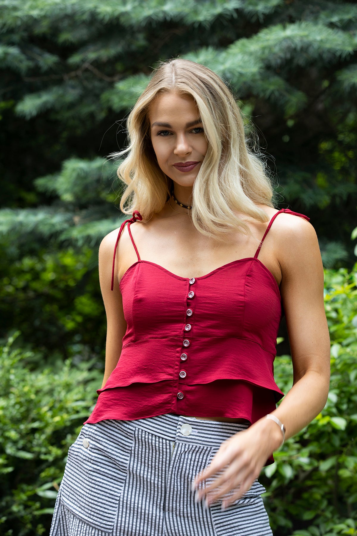 The Brioni Top is a lightweight, breezy top designed to flatter the bust and swing away from the waist with playful ruffles that gently cascade. The top opens fully at the front with faux crystal buttons.