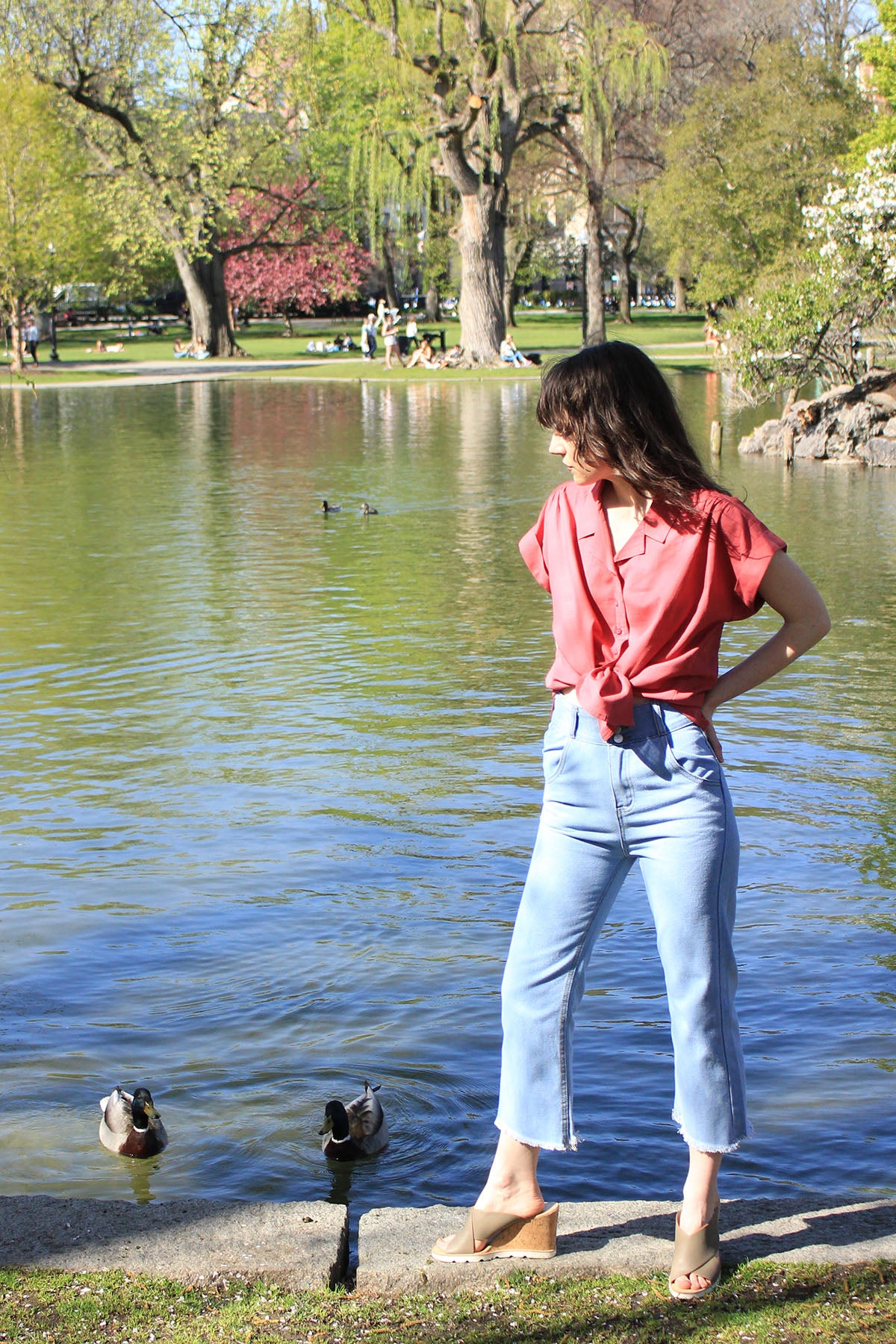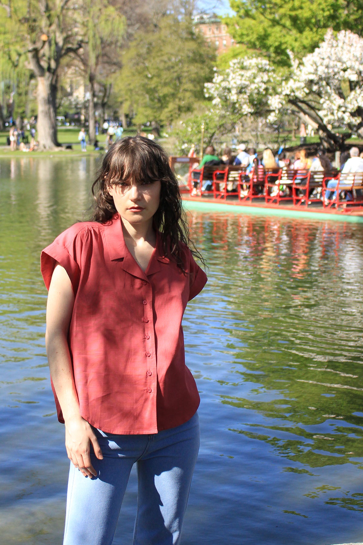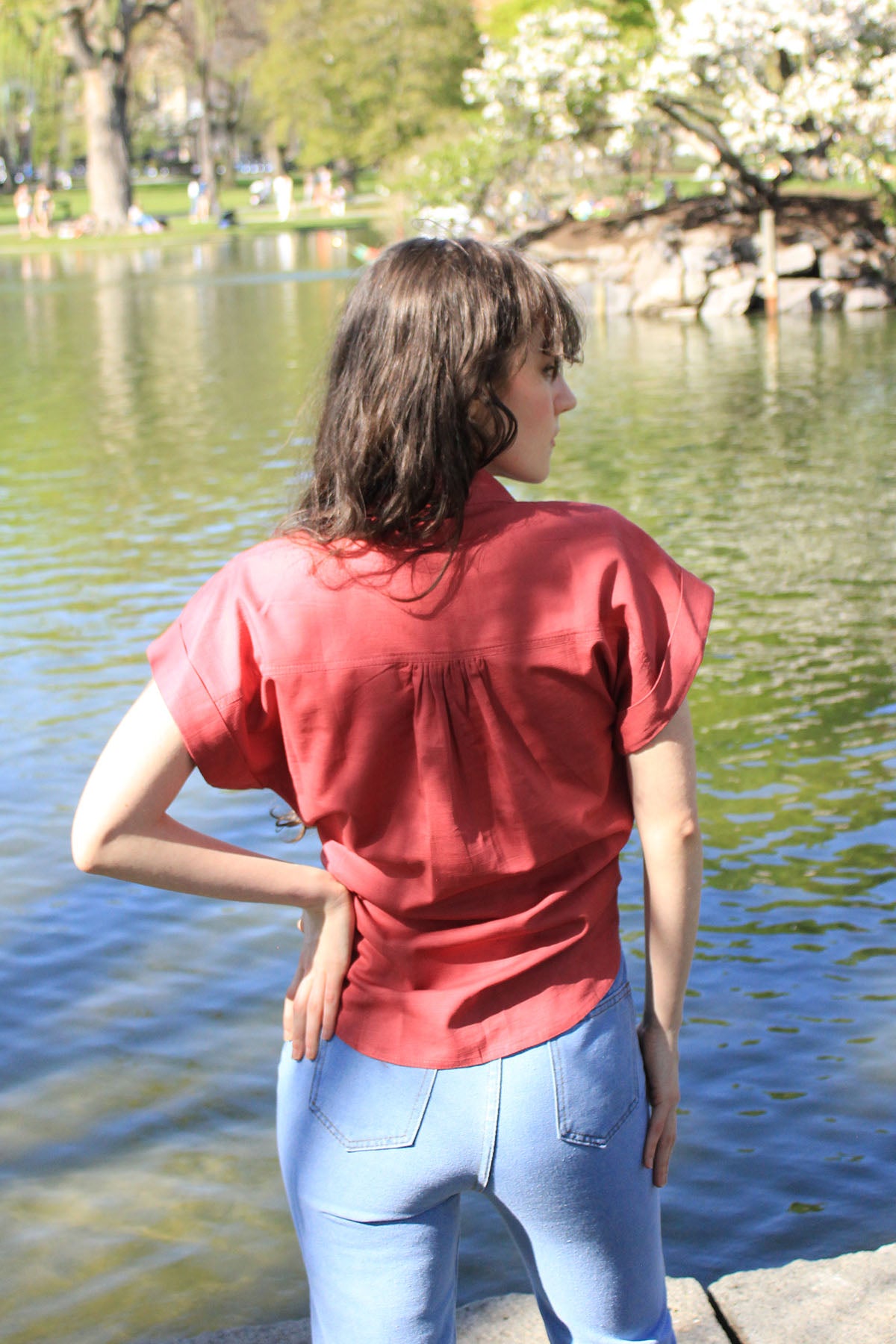 The Riley is a refreshing Terra Cotta colored cotton/linen shirt. The notched collar, gathered shoulder, and banded dolman sleeve lend a vintage charm to this ultra-breathable spring/summer shirt.