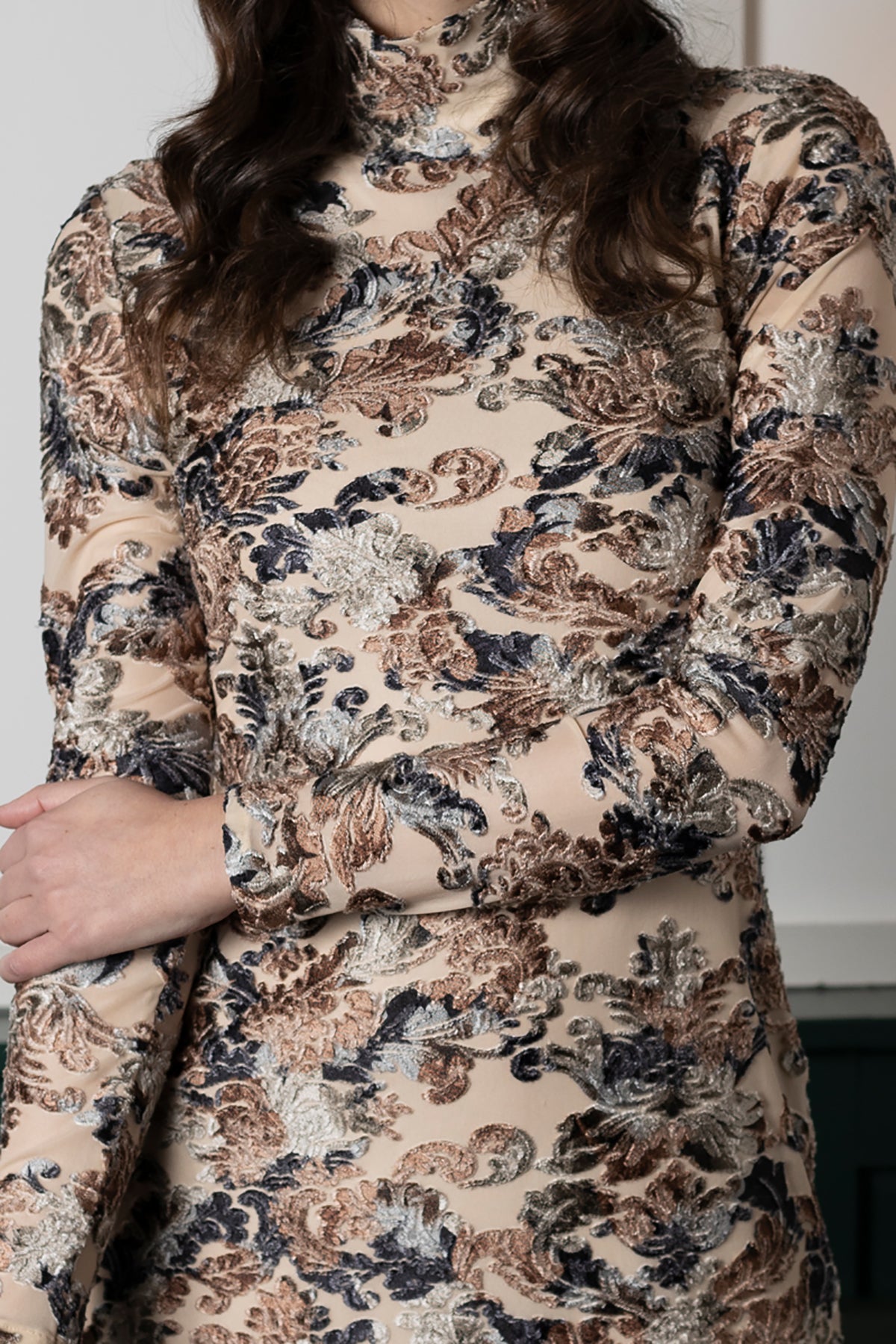 A simple and chic stretch velvet mini dress with a mock neck and long sleeves, the Zoe Dress will keep you toasty and sexy. The fabric features a gorgeous 3D floral velvet burnout and is super soft and stretchy.