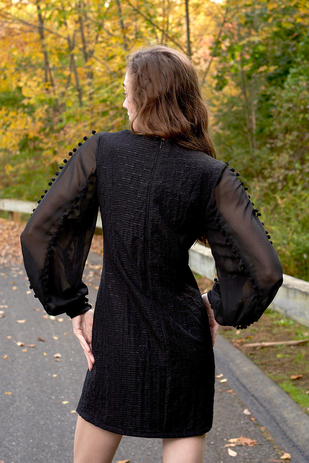 The Curie Dress is an elegant and sexy little black dress with poet sleeves trimmed in black pom poms. The main body features princess seams and the cotton/rayon/lurex shadow stripe fabric is enhanced by the pale blue lining that peaks gently through the shadow stripes. It zips up the center back for easy off/on.