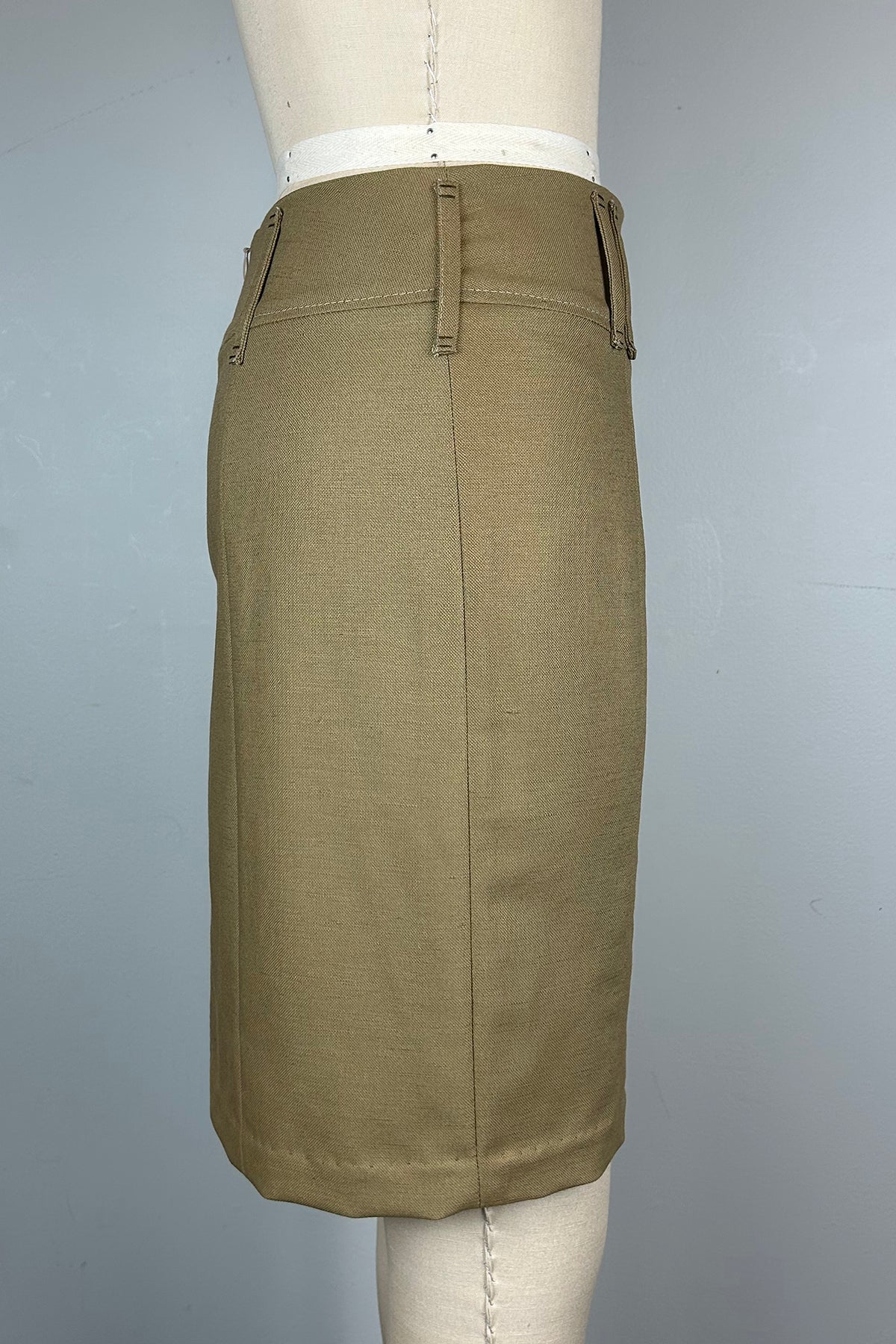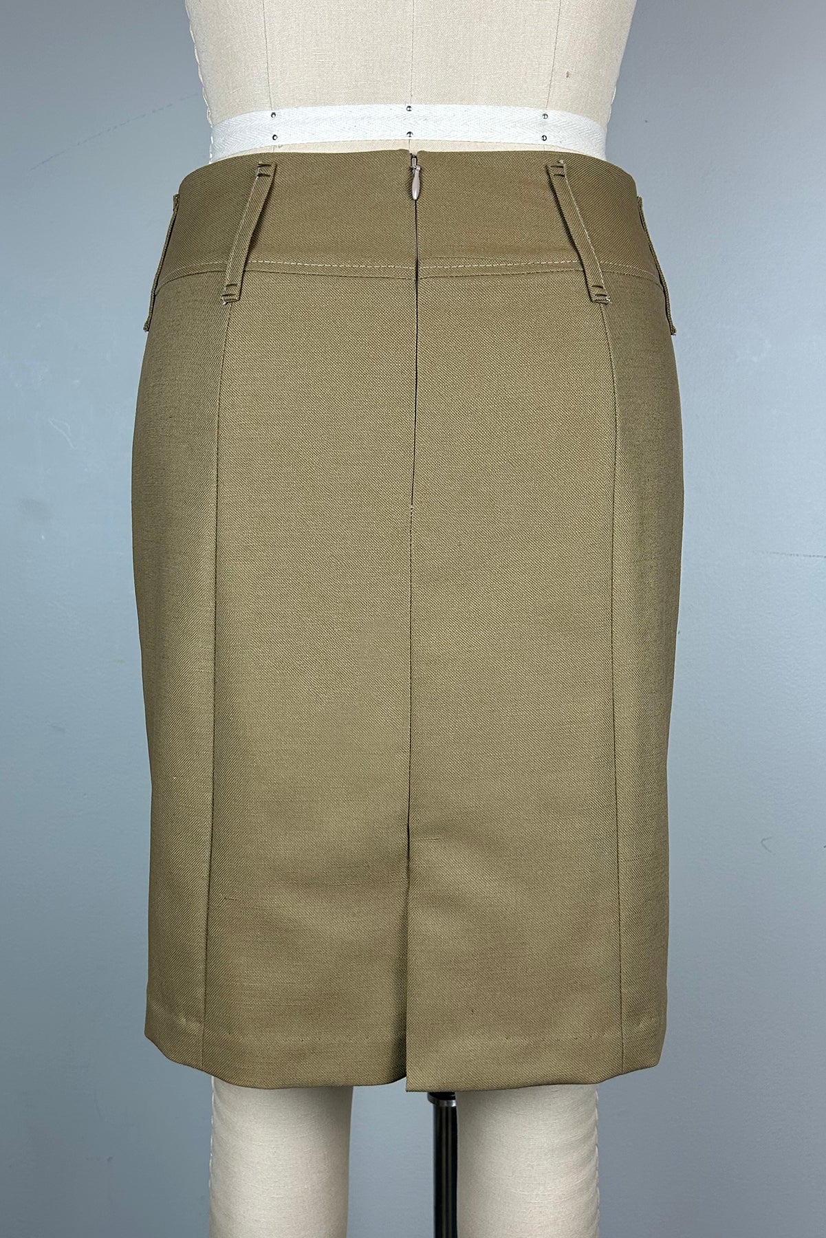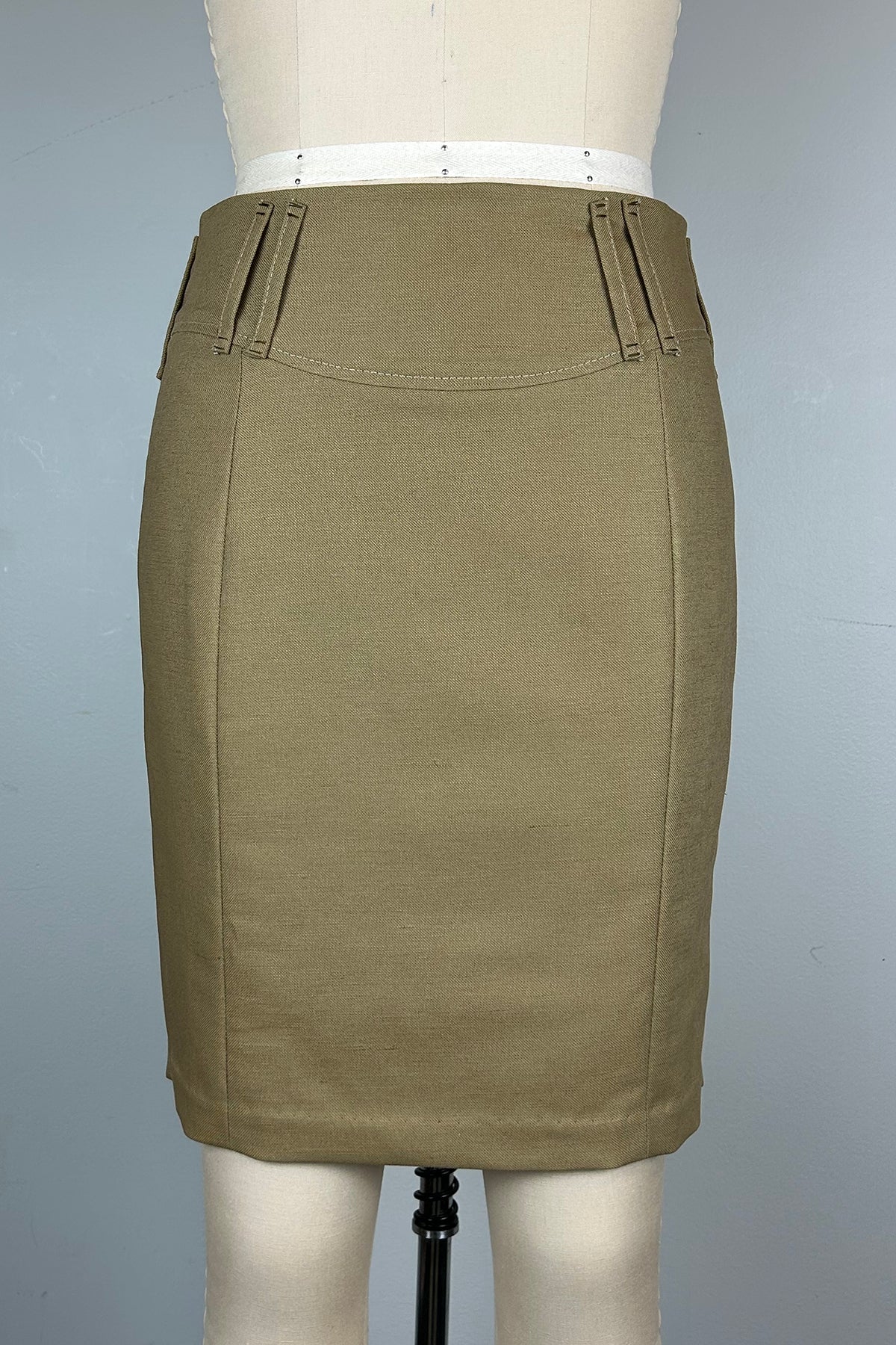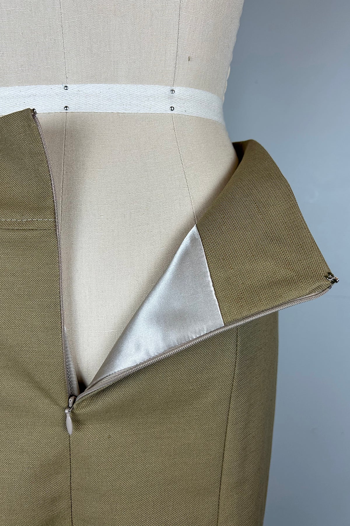 A classic pencil skirt in khaki/light olive 100% linen falling just above the knee, the Daphne boasts a beautiful balance of simplicity and detail. A gently curving yoke seam flatters the tummy and the belt loops accommodate all manner of belts. The skirt is fully lined with satin and feels silky inside. The princess seams are flattering and provide a shapely silhouette. Enter at center back zipper.