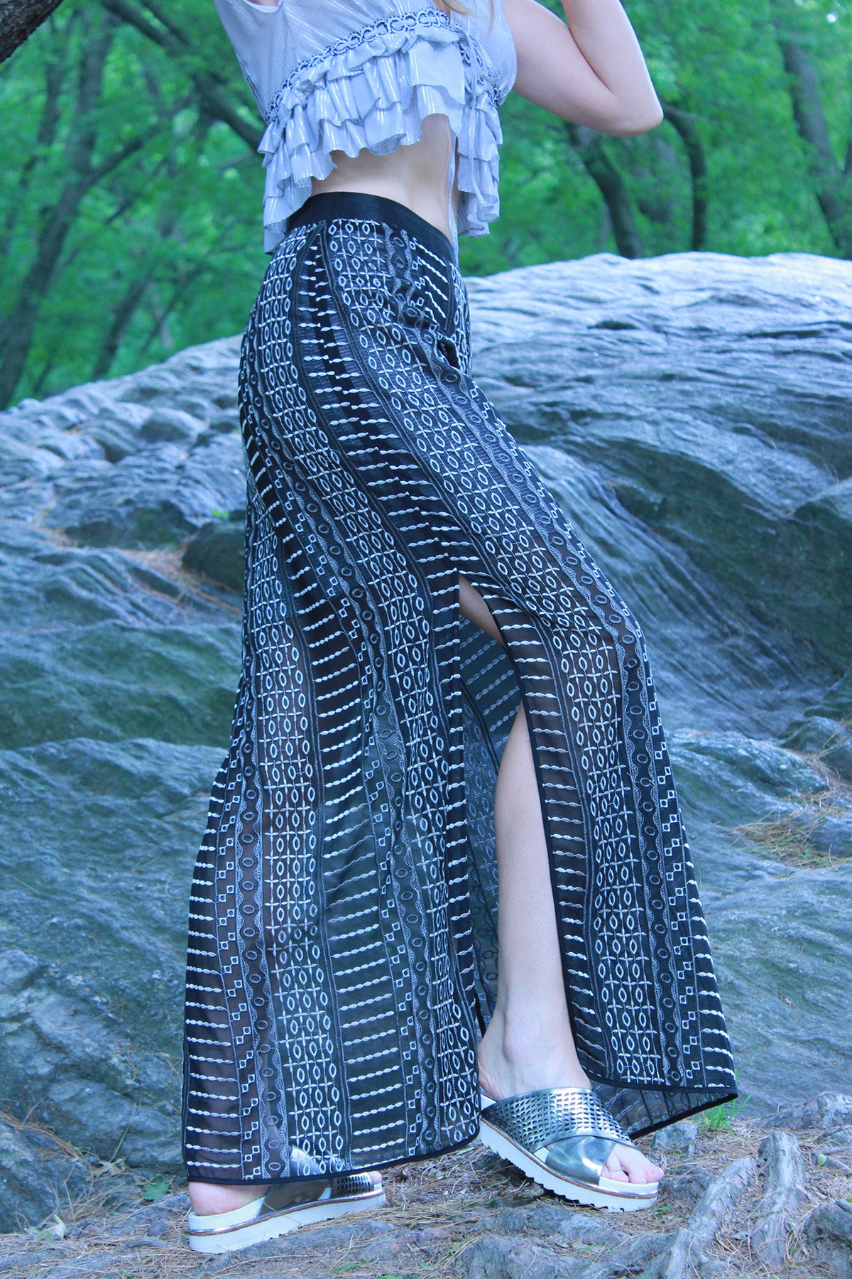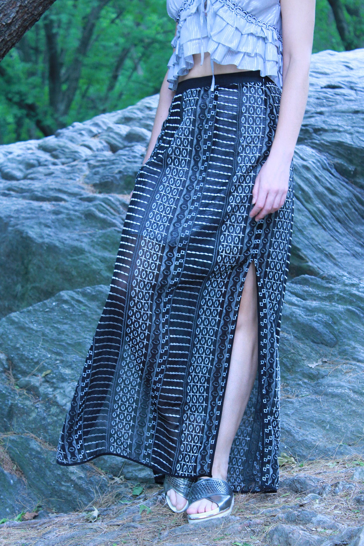 The Rossum Maxi skirt feels graceful and moves beautifully. Perfect for dressy evening outings, like catching a ballet at the Met, or a birthday dinner at a fine restaurant. The embroidered chiffon is lined to the mid-thigh with a subtle striped silver cotton that peaks through the sheer shell, adding dimension. Side slits create beautiful, dramatic movement when walking or sitting.