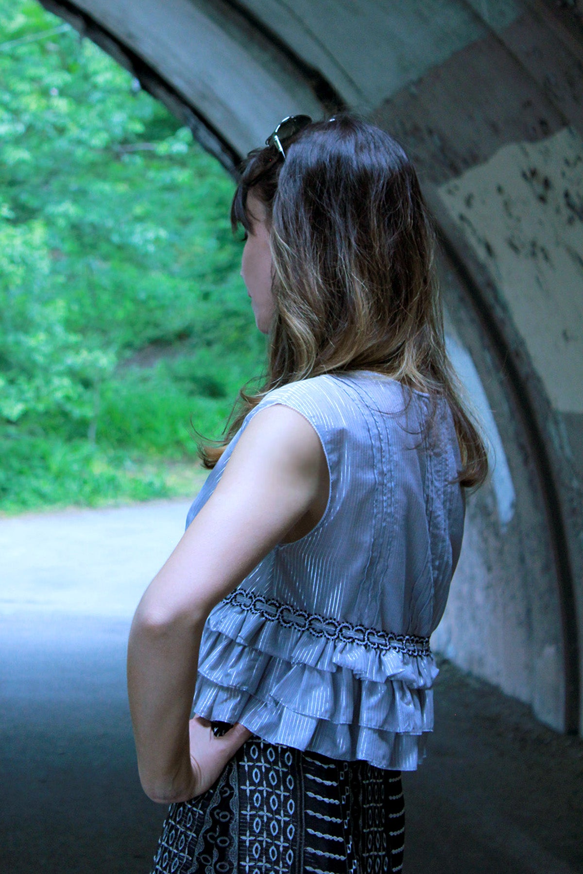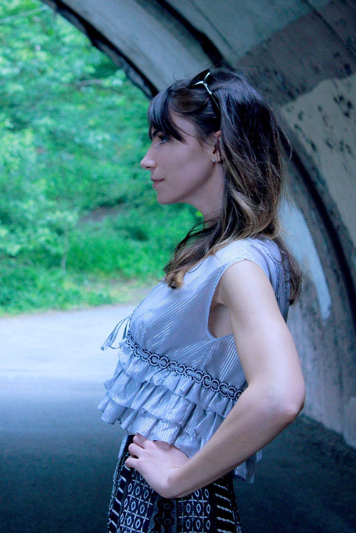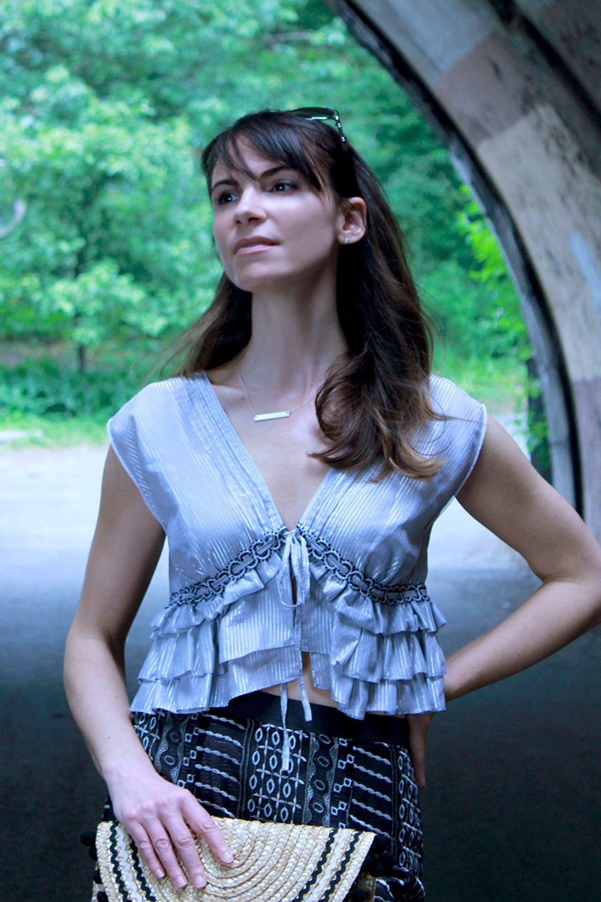 A flirty, fun, summery crop top that simply ties on so you can jump out the door. The silver striped lurex/cotton fabric is lightweight and looks great for nights out on the town, as it reflects those flashing city lights. The empire waistline flatters the bust and features a braided trim, woven through with silver drawstring ties. An exuberant addition to your closet that will pair perfectly with high-waisted jeans, or with the high-waisted Jacen Wide Leg Pant or Rossum Maxi Skirt.