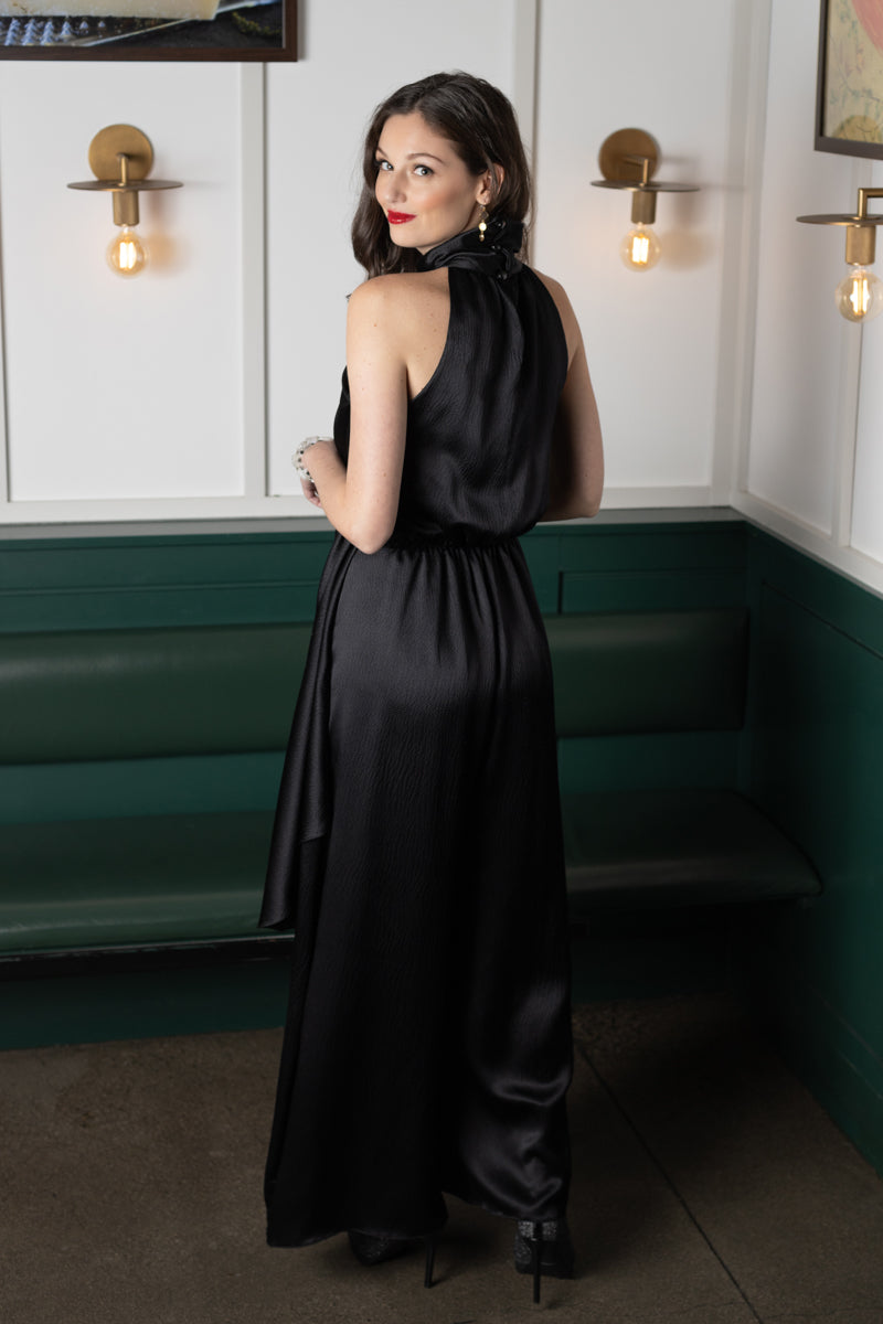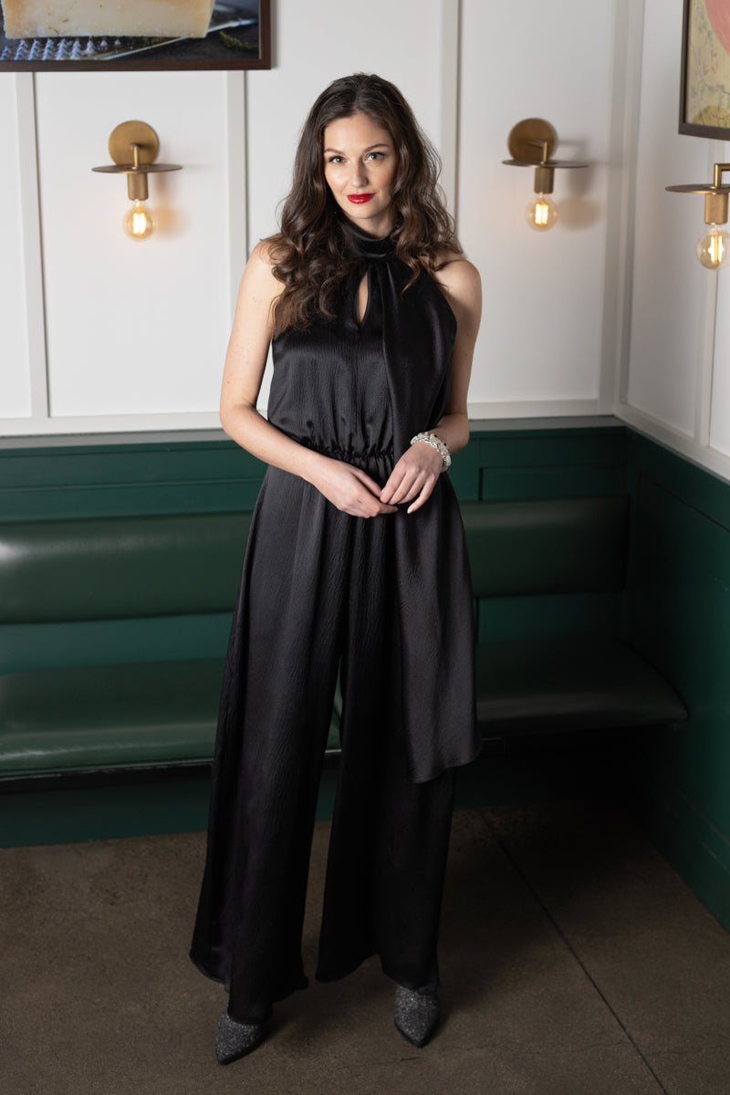 An avant-garde, drapey, flowy, silk jumpsuit in deep, inky black hammered silk, the Charlotte Jumpsuit will have you feeling like an elegant Greek Goddess. Hammered silk gives the otherwise smooth surface of silk a gentle pebble texture for visual interest. A high collar buttons at the center back with three faux-onyx jet black buttons and button loops. A bias-cut draped panel falls gently to one side and the elasticized waist is as comfortable and stretchy as can be. The garment opens at the hidden side zipper on the wearer's left side seam. The flowy pant legs are an elegant wide leg. The inseam is customizable at checkout by adding a note with your inseam in the "special instructions" box. Standard inseam is 31".