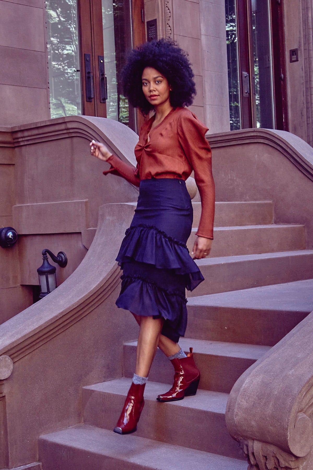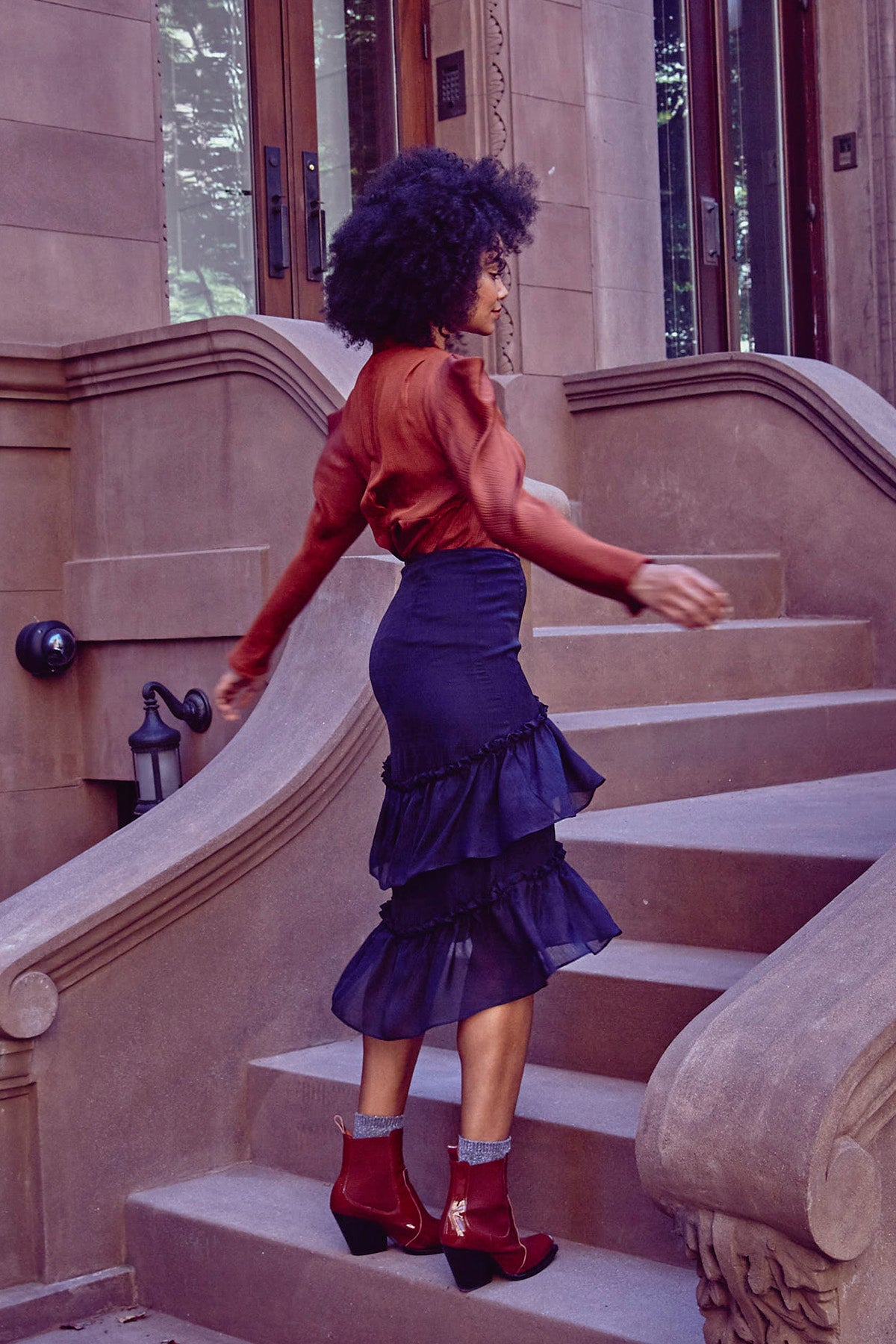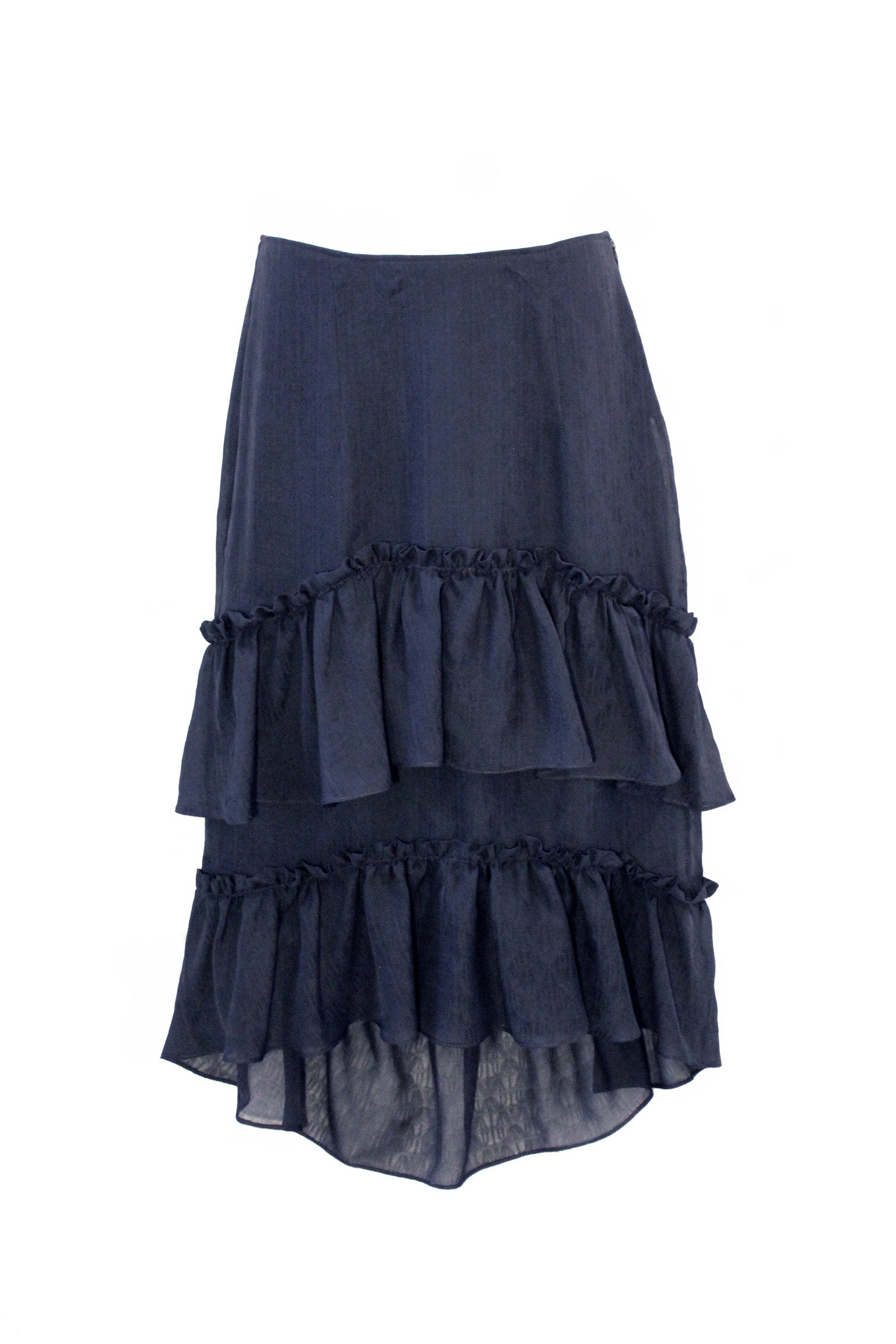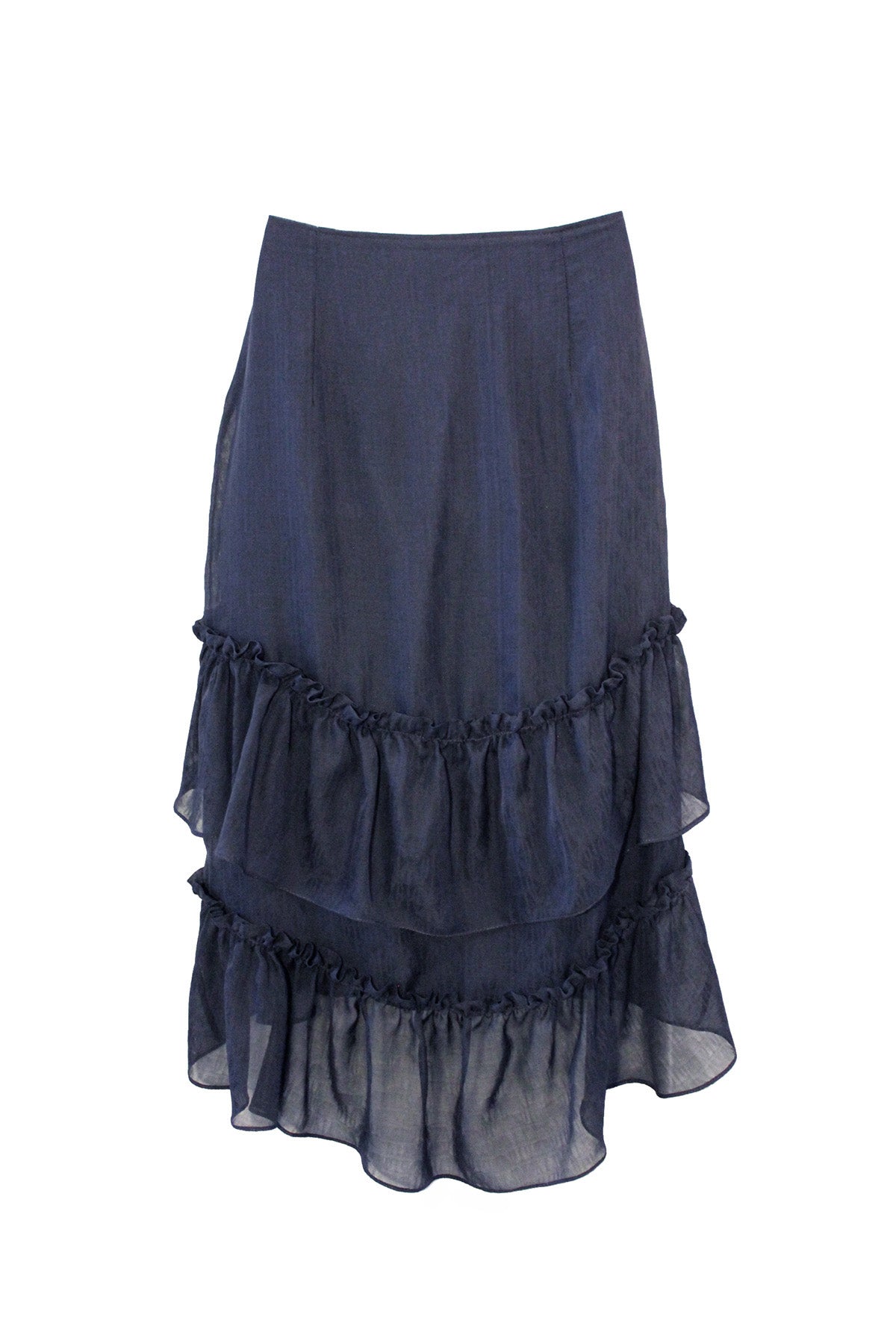 The gathered ruffle tiers of this high-low midi skirt sweep gracefully around the legs for amazing movement while walking. This is the perfect going-out skirt to pair with any top for attending events, dinners, or stepping out with friends. It is ultra light-weight and feels like wearing air. An interesting color that in different lighting reads navy blue, black, or even has a purplish cast, the silk chiffon jacquard fabric shimmers with the natural sheen of silk in an intricate geometric jacquard pattern.